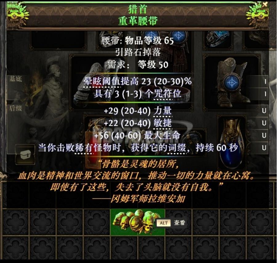流放之路(猎首 重革腰带)属性:移动速度 20 伤害15稀有怪掉落额外物品